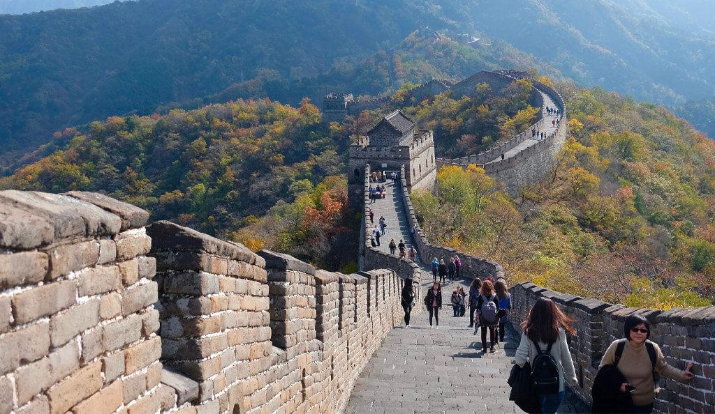 Proslavená je především Velká čínská zeď. Dlouhá je úctyhodných 21 000 kilometrů a začala se stavět 220 let před naším letopočtem. Měla obranný charakter. Jedním z nejnavštěvovanějších míst Velké čínské zdi je Mutianyu a Badalin. Naskýtají se zde dechberoucí pohledy do hlubokých a zalesněných roklí. K využití je pro turisty u Mutianyu (dlouhá je přibližně 20 kilometrů a má 22 zachovalých strážních věží) rovněž lanovka a na zpáteční cestě dokonce i tobogan.